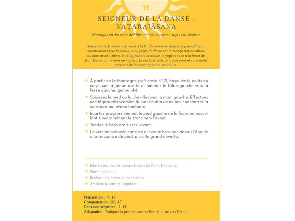 Ce jeu de 50 cartes, accompagné d’un livret de 24 pages, vous permettra de fabriquer vos séances de yoga à la maison. Vous pourrez adapter vos séances selon :