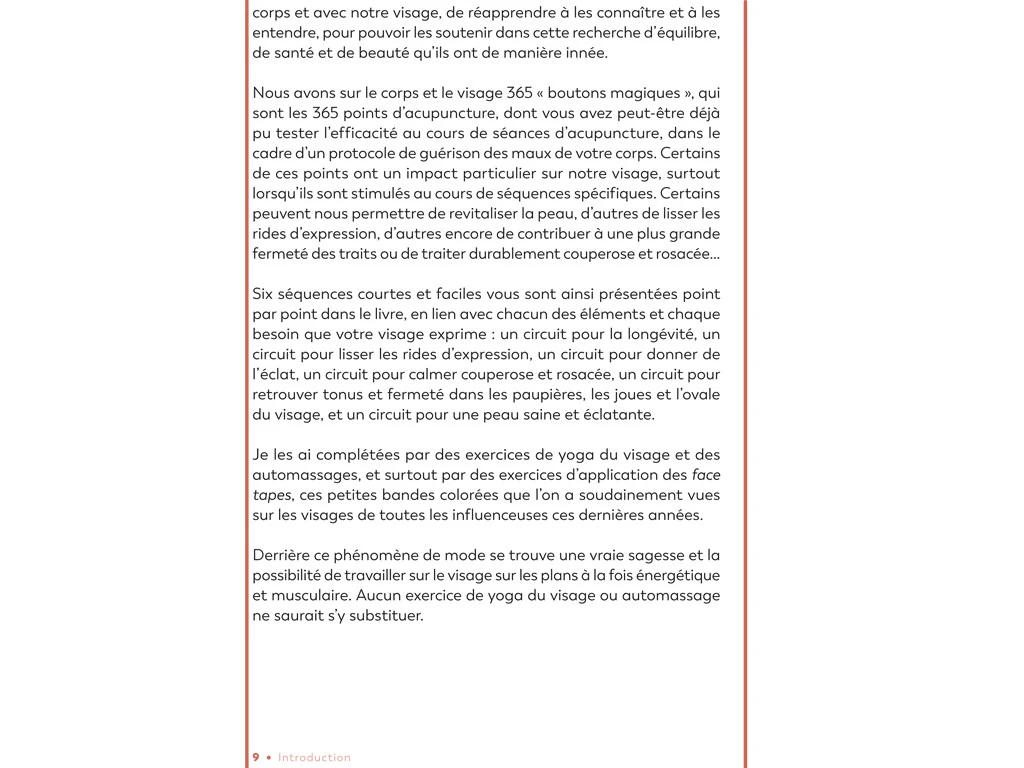 » le mode d’emploi pour une application ultra-pratique : 15 protocoles d’acupression, 25 exercices de yoga du visage et 16 applications de face taping, ainsi que les aliments et les couleurs de vêtements à privilégier.