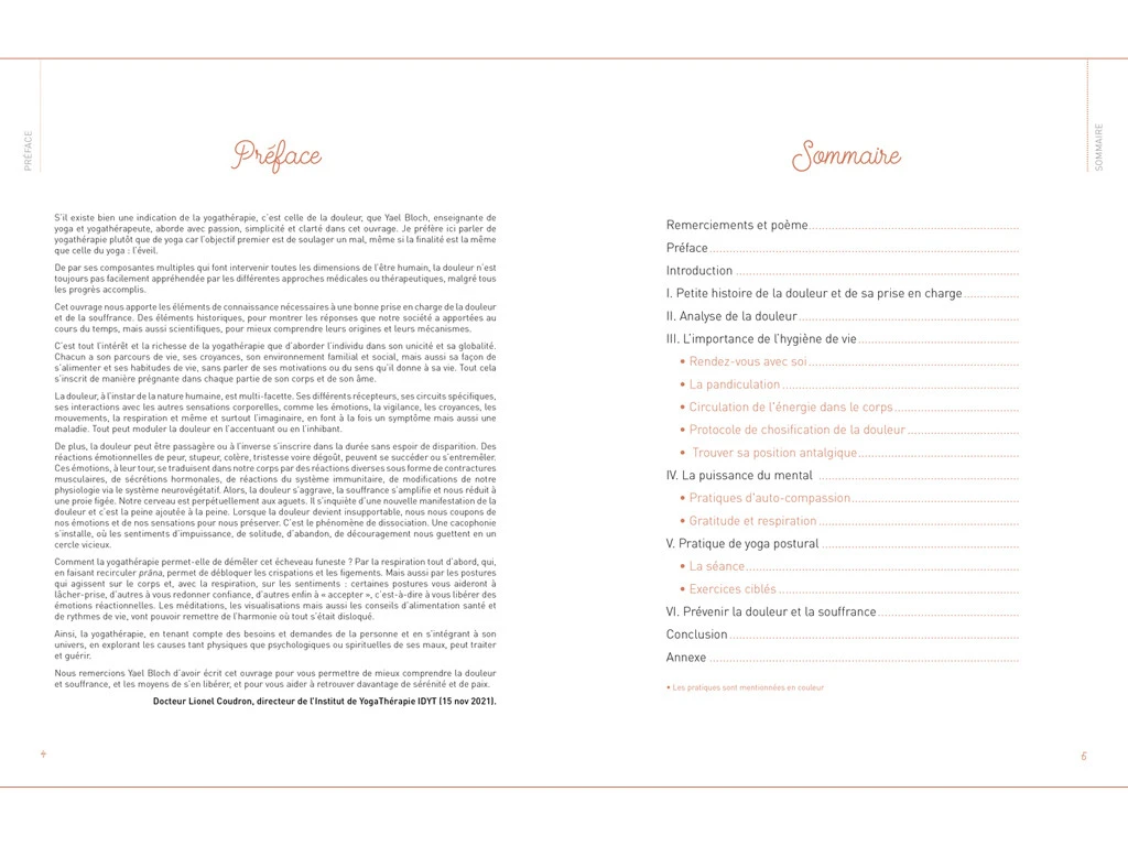 Le livre explore comment soulager naturellement nos maux grâce au yoga, comment retracer leur origine et comprendre leur utilité (messages que le corps envoie pour alerter).